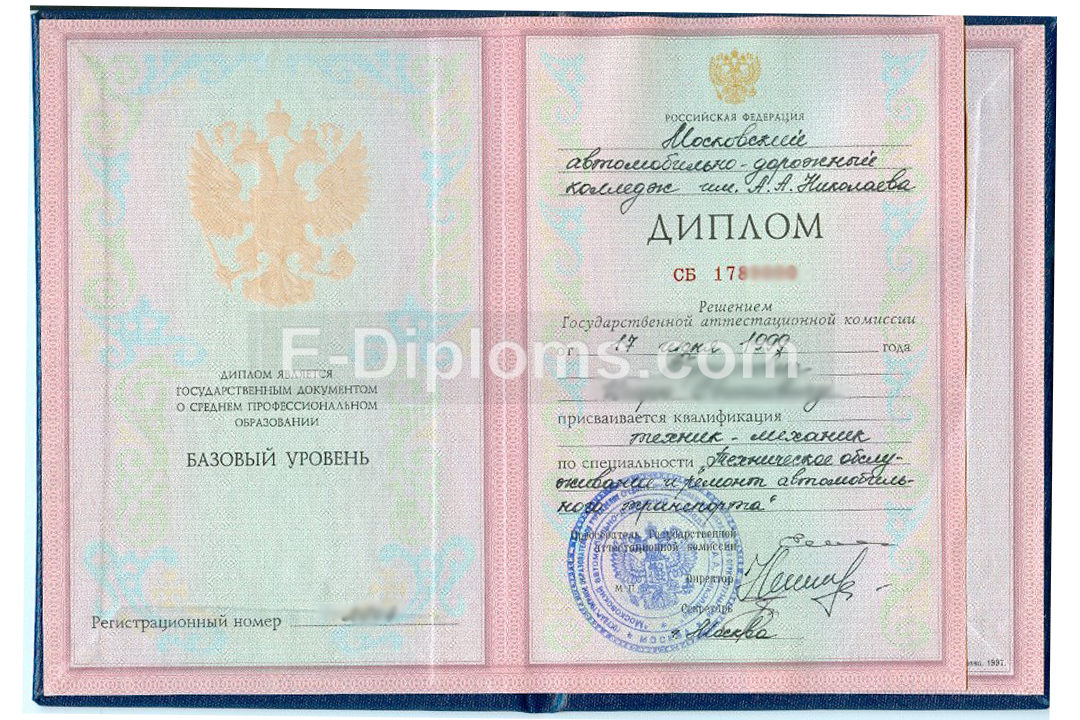 У нас на сайте Вы можете заказать диплом о среднем профессиональном образовании с окончанием любого техникума или колледжа России в период с 1997 по 2003 года включительно. Сделаем диплом по любой профессии, который подойдет для работы в интересующей Вас сфере. Доставка бесплатна, оплата при получении, для проживающих в регионах доступна услуга «макет», есть скидки. При заказе до 14.00 привезем уже завтра!