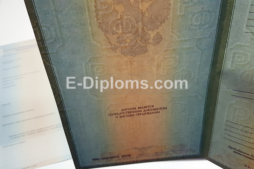 Дипломы на таких же бланках, которые получали выпускники ВУЗов России с 2004 по 2009 года включительно. Учебная программа и все данные по образовательной организации соответствуют периоду; ставим гербовую «мокрую» печать и подписи, как в оригинале.